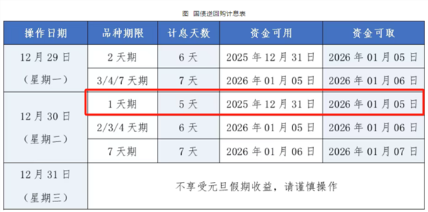 12月30日(周二),投资者可以借出1天期逆回购(沪市逆回购简称GC001,代码204001;深市逆回购简称R-001,代码131810),就可以收获5天利息,资金在2026年1月5日盘前已可提现。